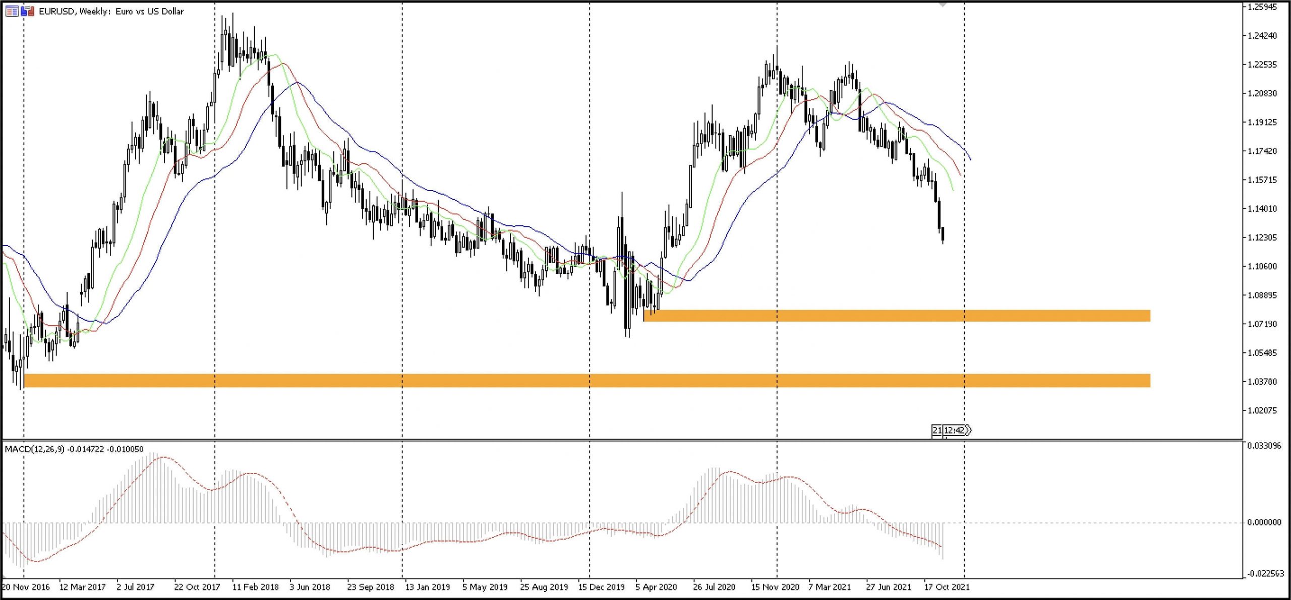 Динамика котировок валютной пары EUR/USD с 20 ноября 2016 г. по 25 ноября 2021 г., торговый терминал MetaTrader 5, свечи W1. Дата обращения: 25 ноября 2021 г. Котировки предоставлены международным брокером AMarkets. Данная информация не является инвестиционным советом.