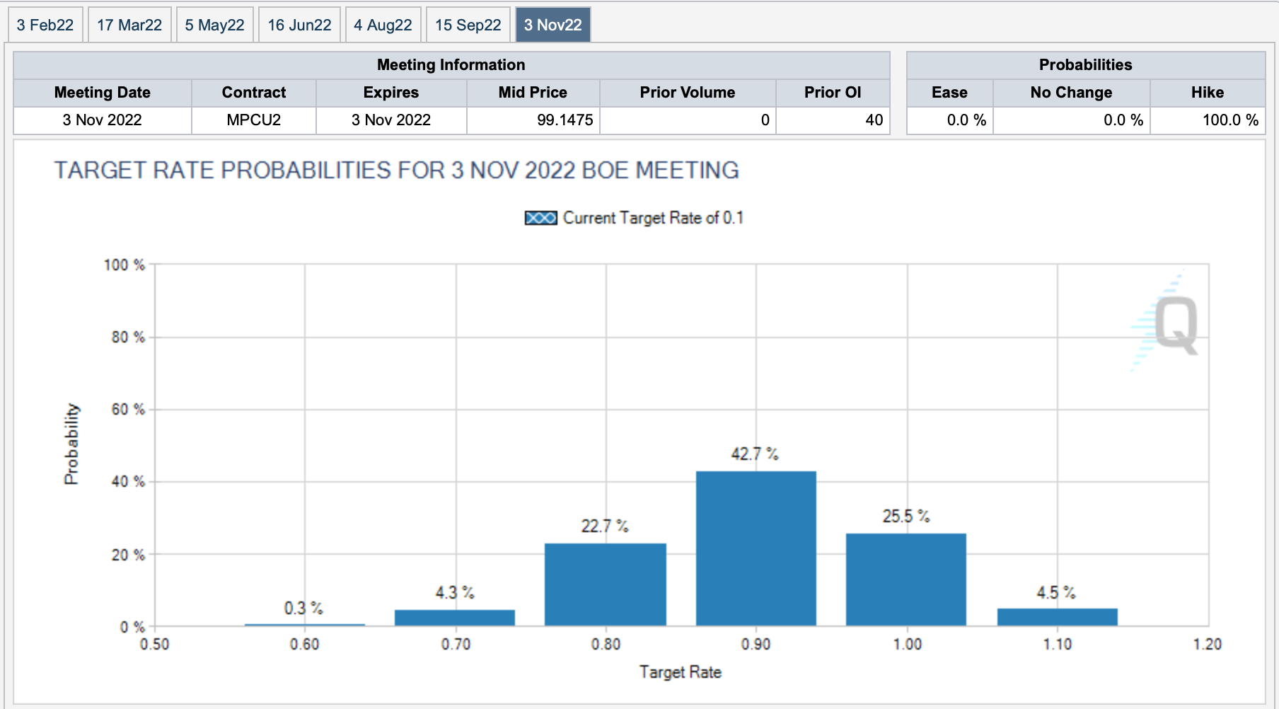Распределение вероятностей значений ключевой ставки процента в Великобритании на 3 ноября 2022 г. Дата обращения: 06.01.2022. Источник: CME BoEWatch Tool.