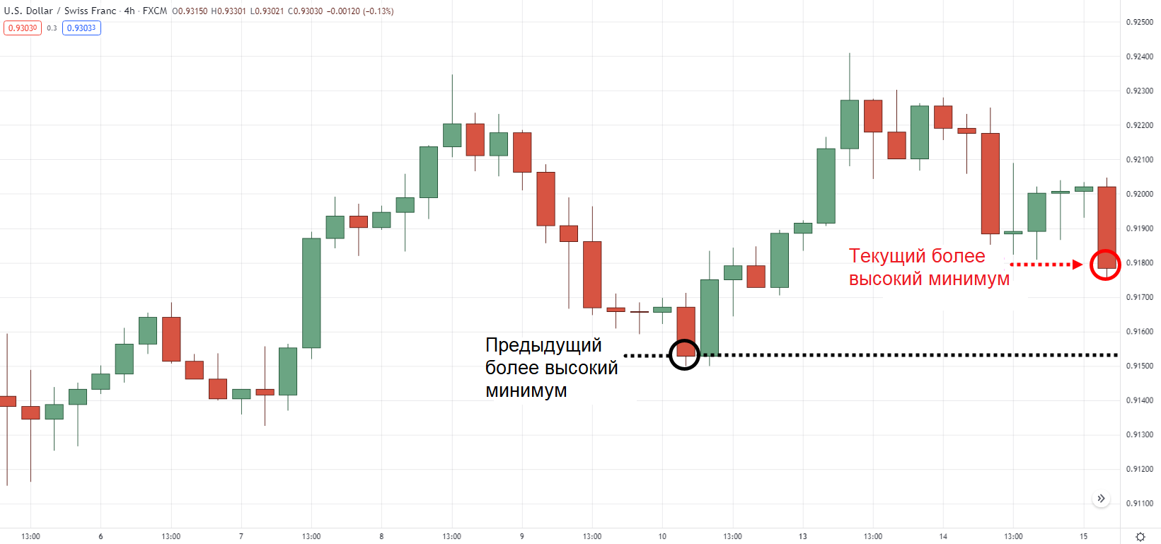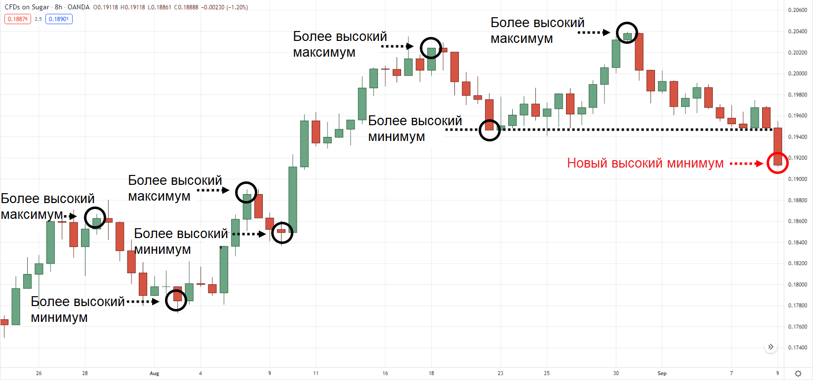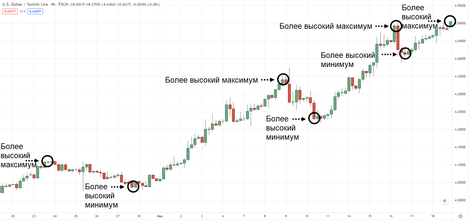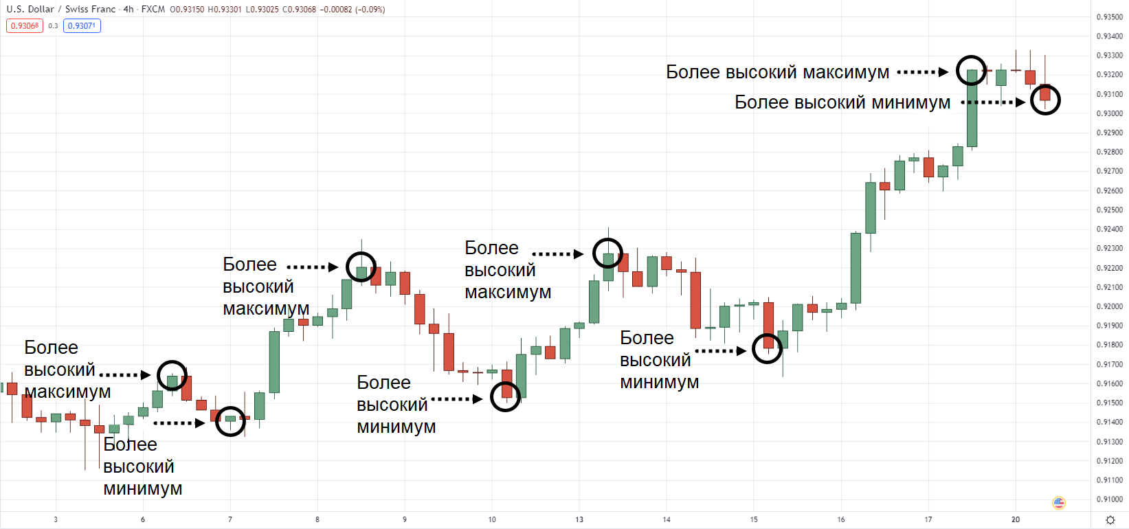 С другой стороны, более высокие минимальные значения — это «донные» уровни на графике, которые выше, чем предыдущее минимальное значение.