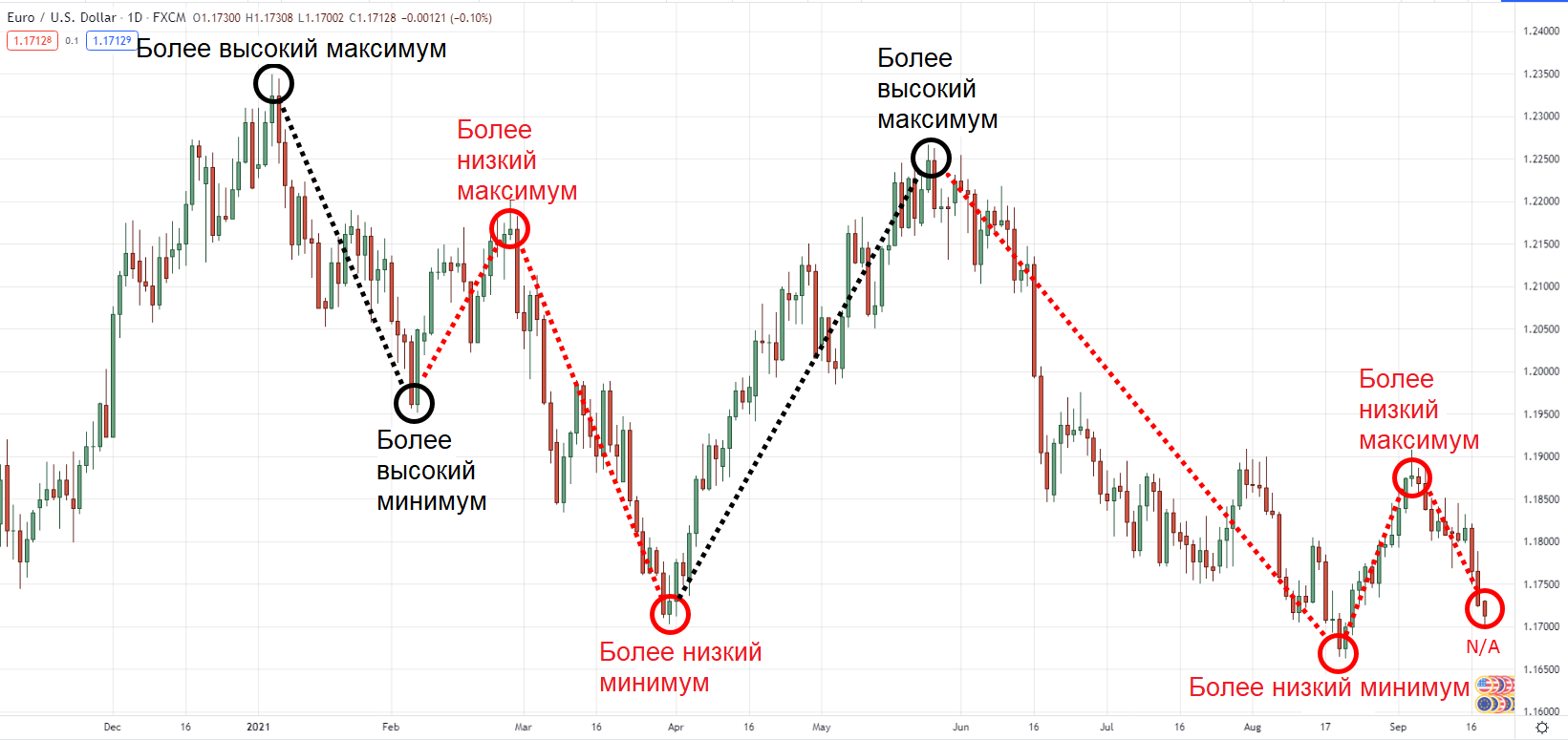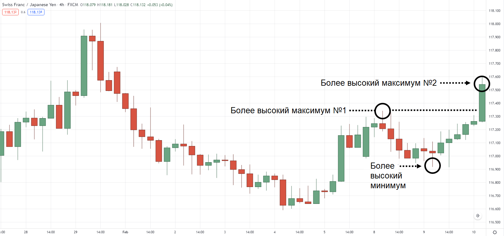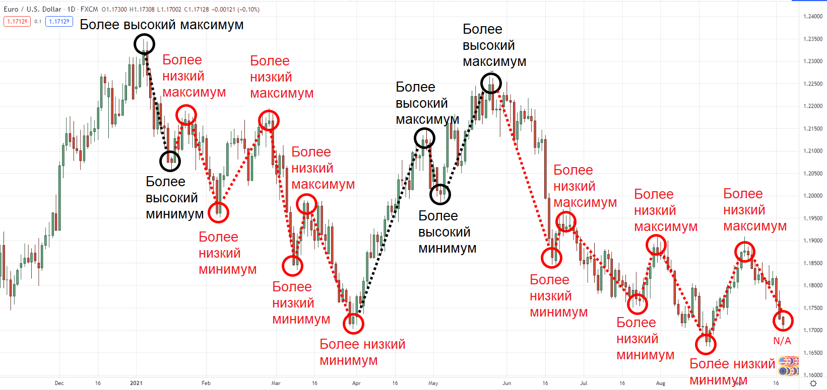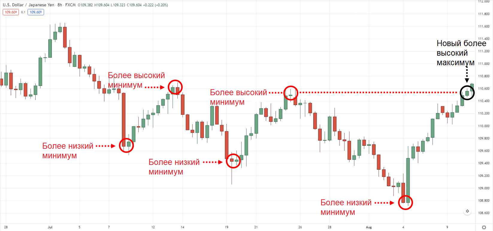 С другой стороны, более высокие минимальные значения — это «донные» уровни на графике, которые выше, чем предыдущее минимальное значение.