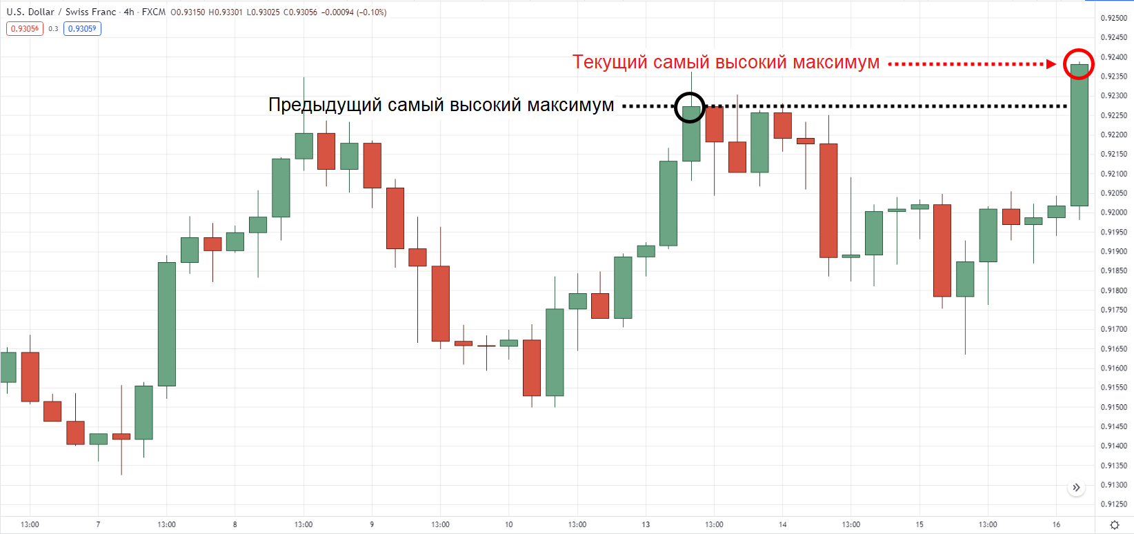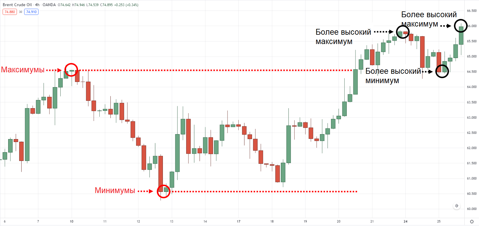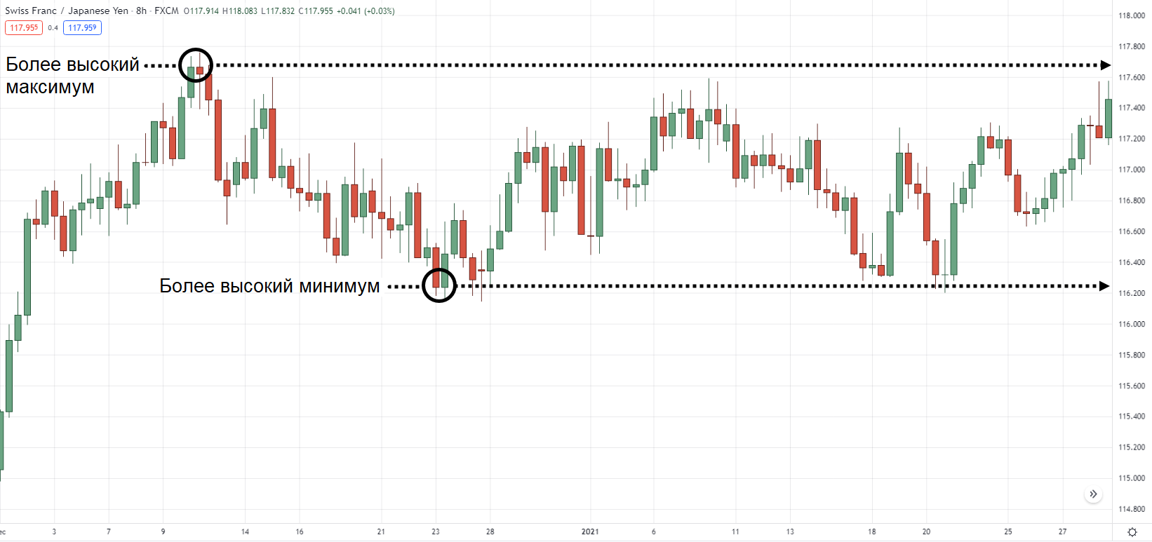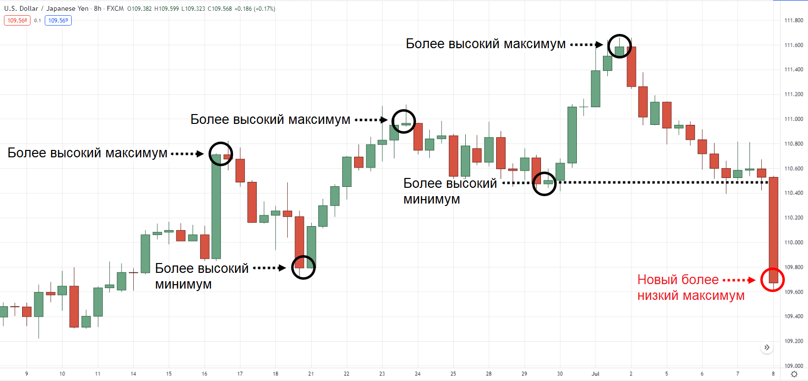 С другой стороны, более высокие минимальные значения — это «донные» уровни на графике, которые выше, чем предыдущее минимальное значение.