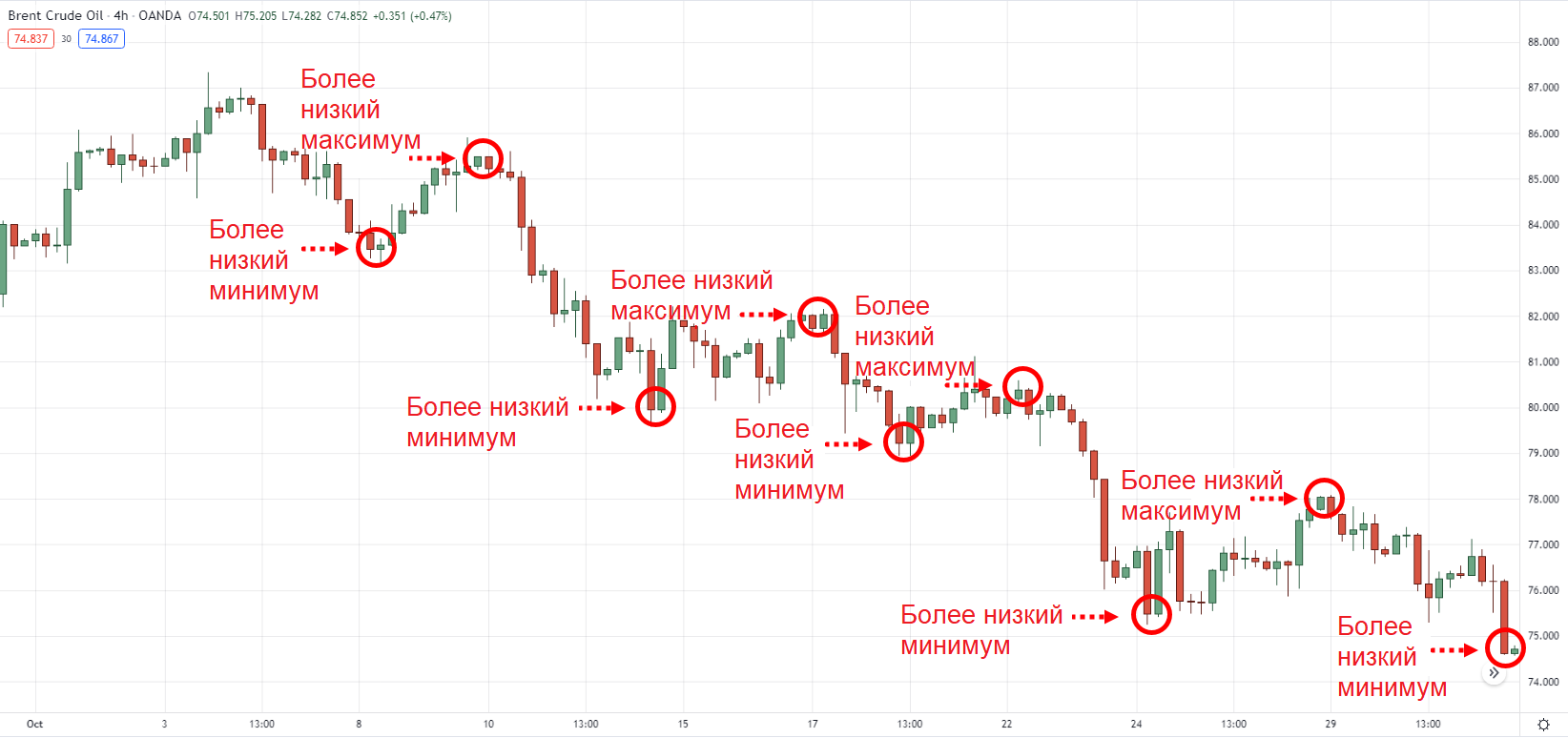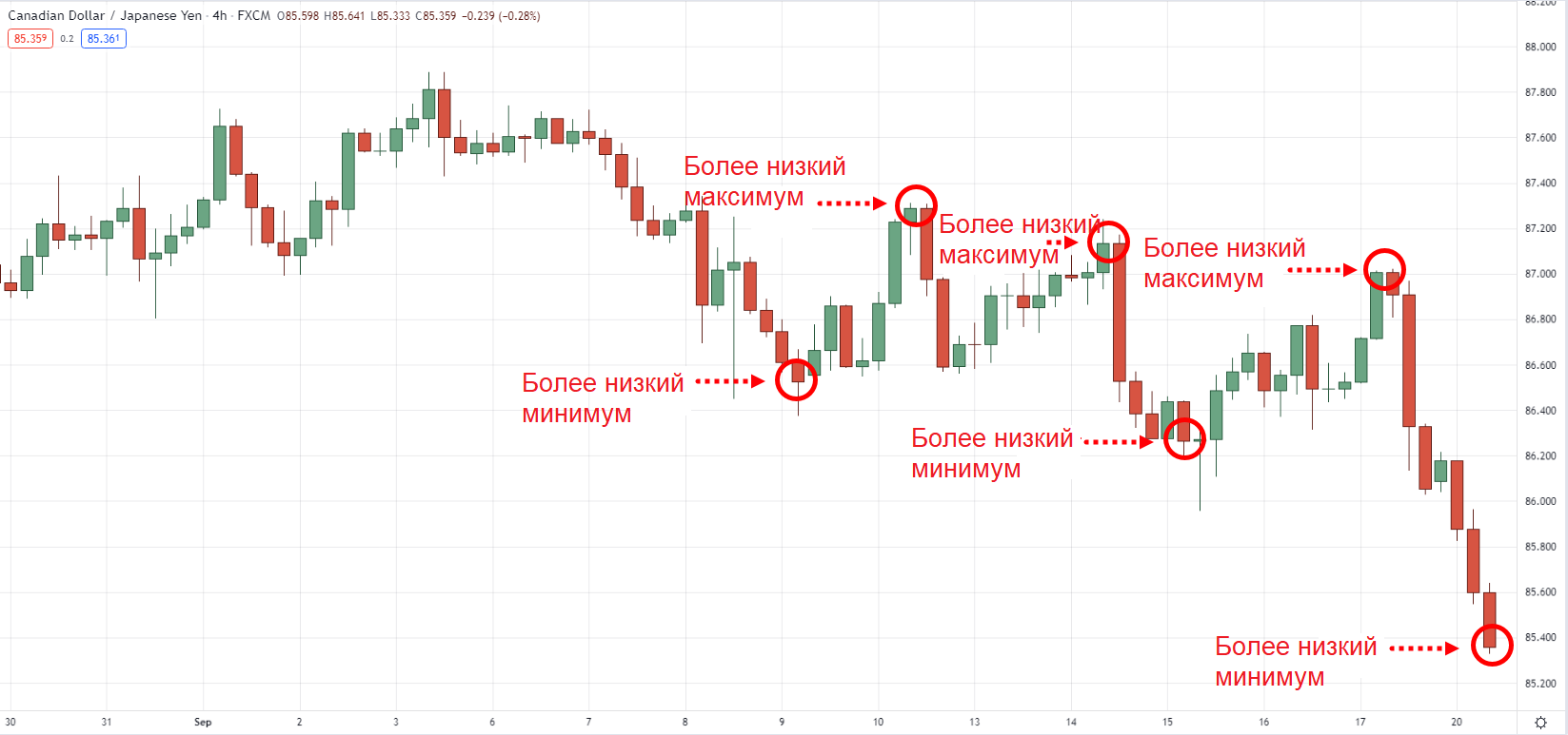 Падающий тренд состоит из более низких максимальных и более низких минимальных значений.