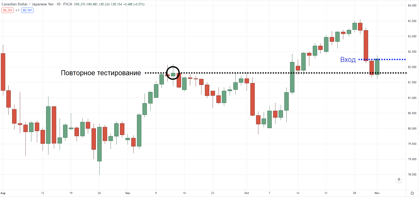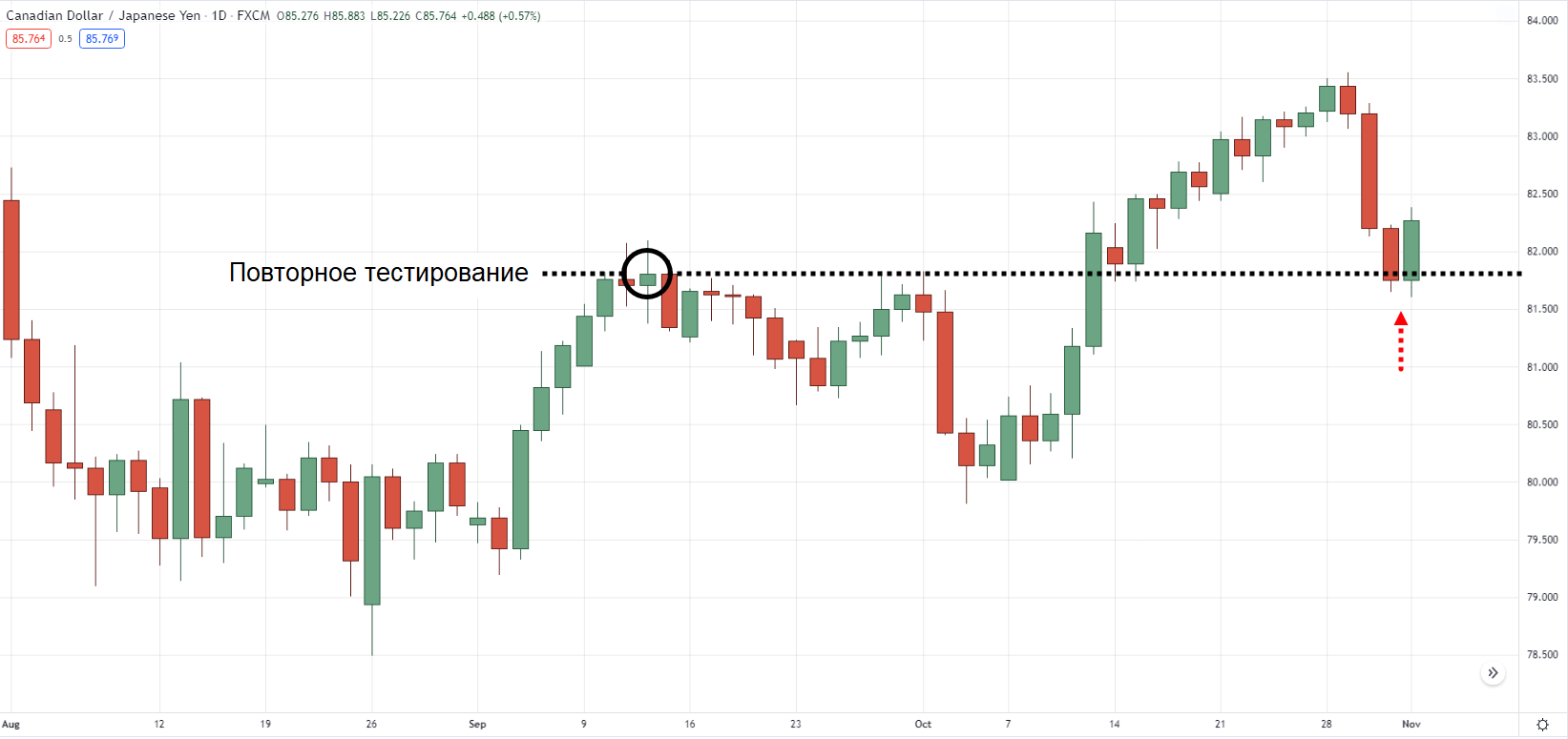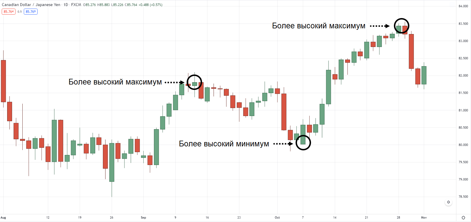 В примере ниже можно видеть, что CAD/JPY на дневном таймфрейме находится в действующем растущем тренде. Так как цена демонстрирует свой второй самый высокий максимум: