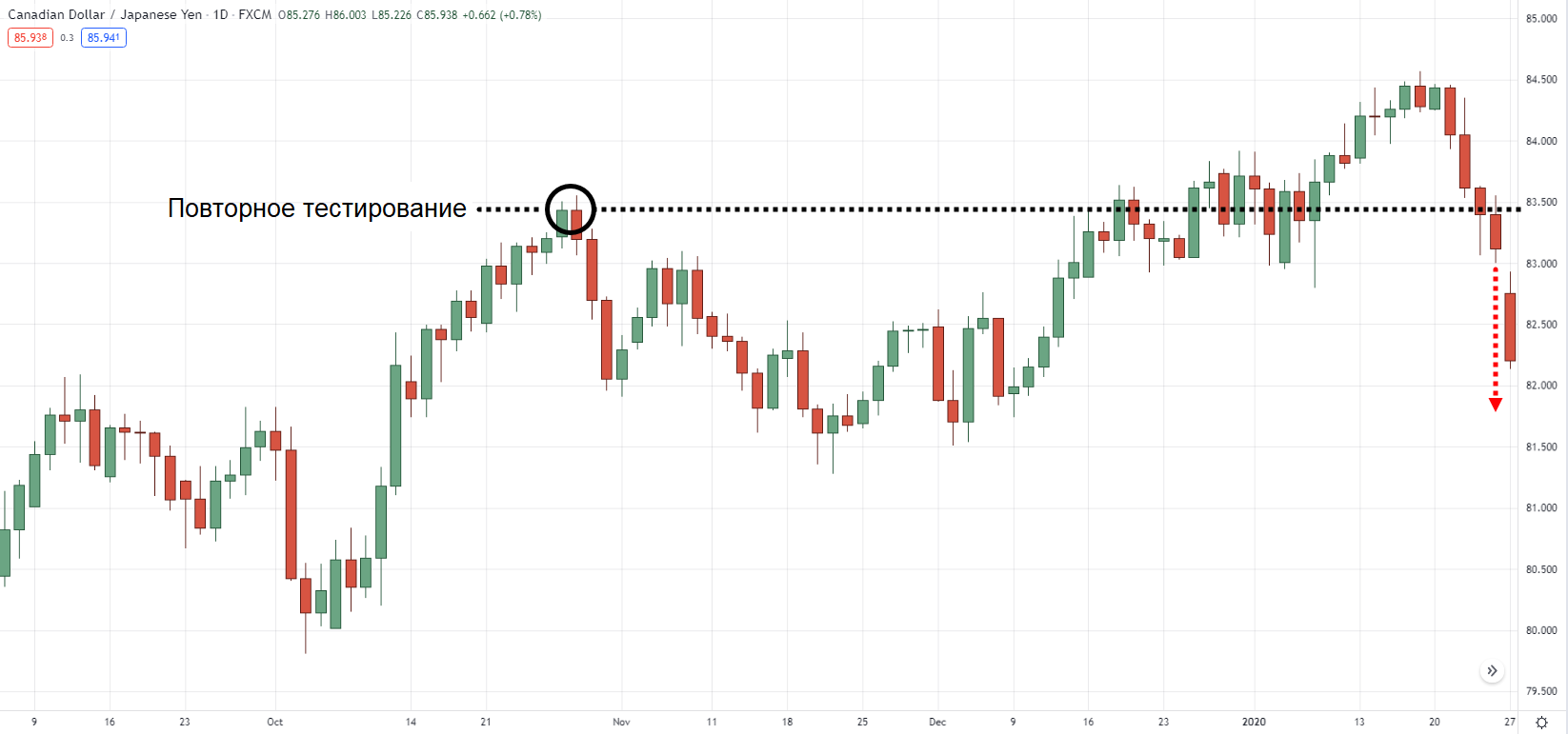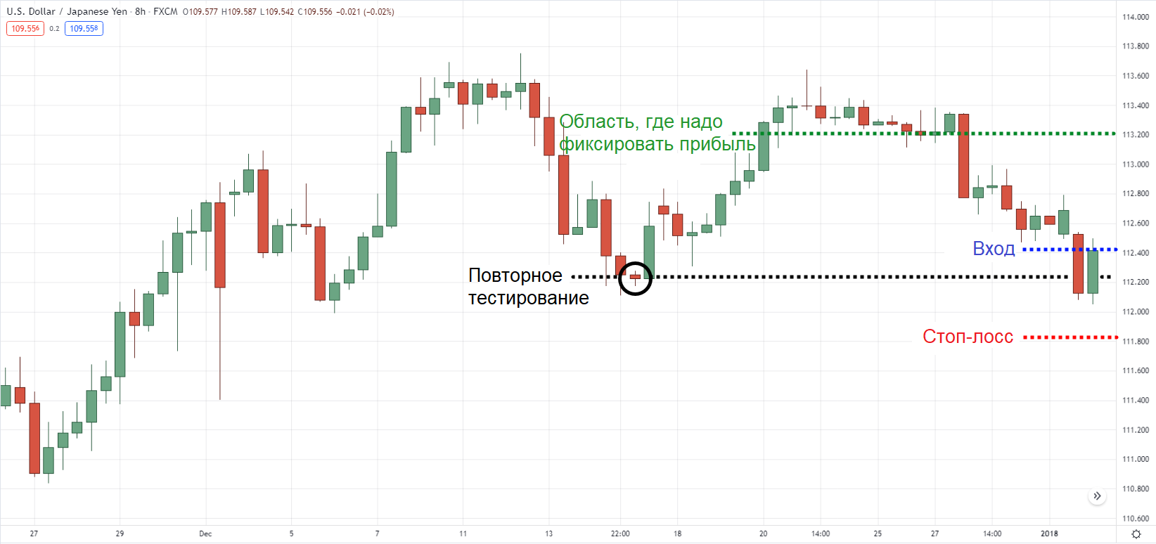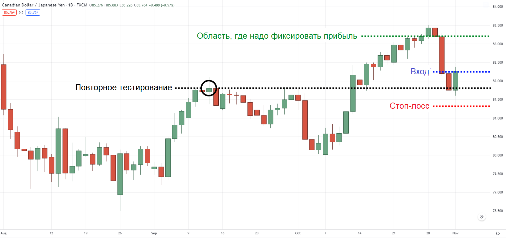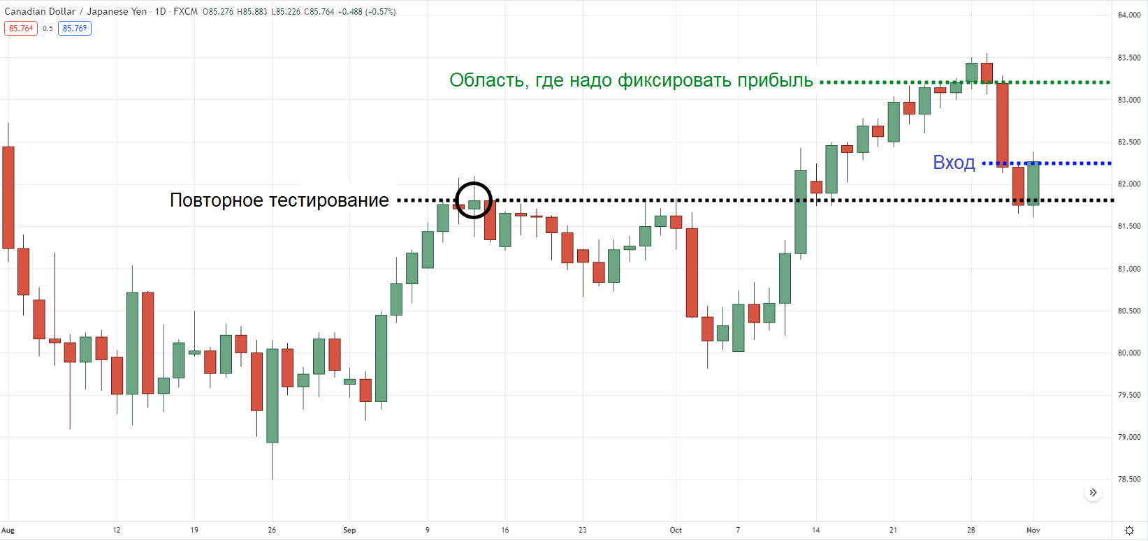 Поскольку мы ищем «область ценности», нужно подождать, пока цена пойдет вниз и повторно протестирует предыдущее более высокое максимальное значение.