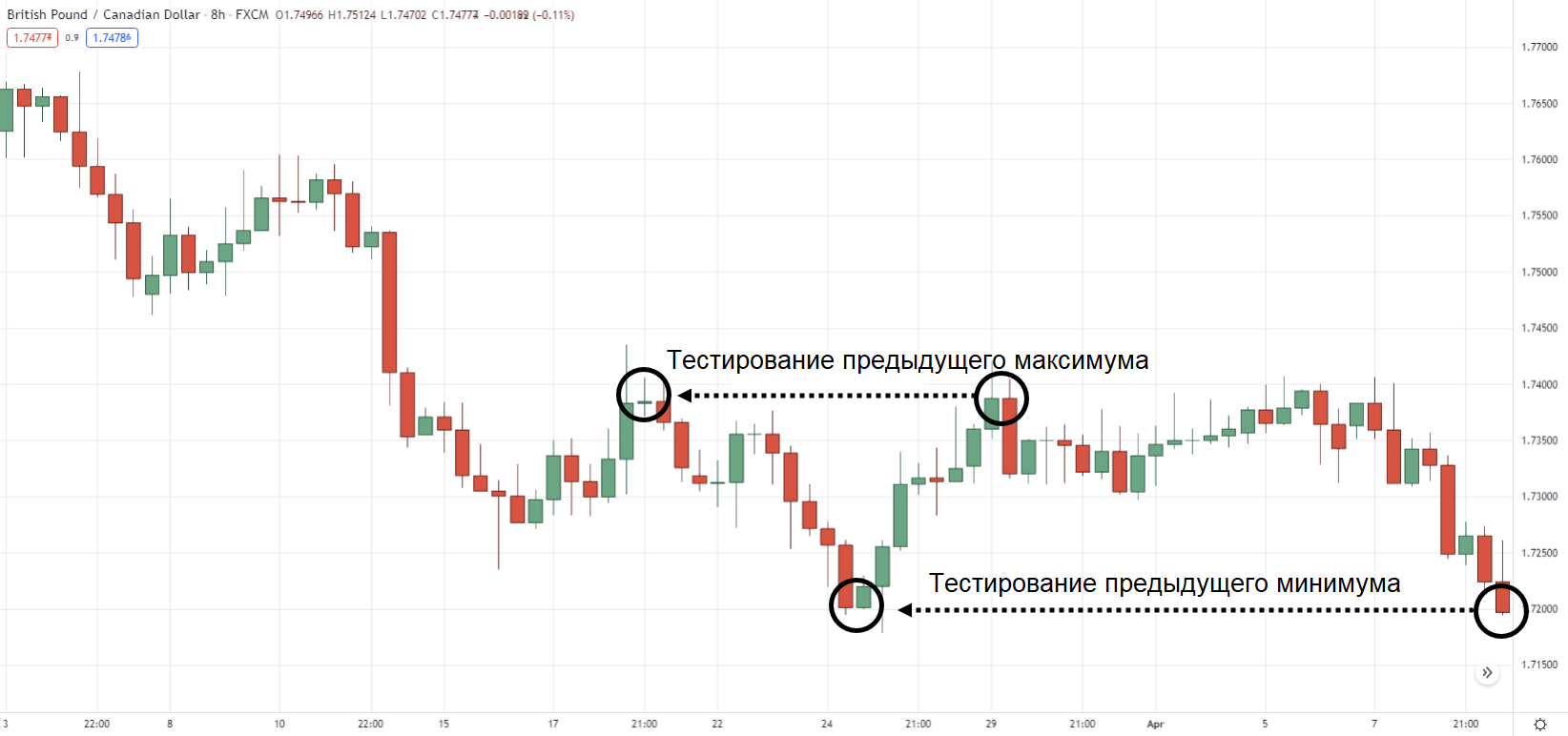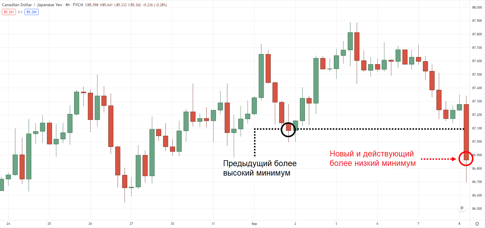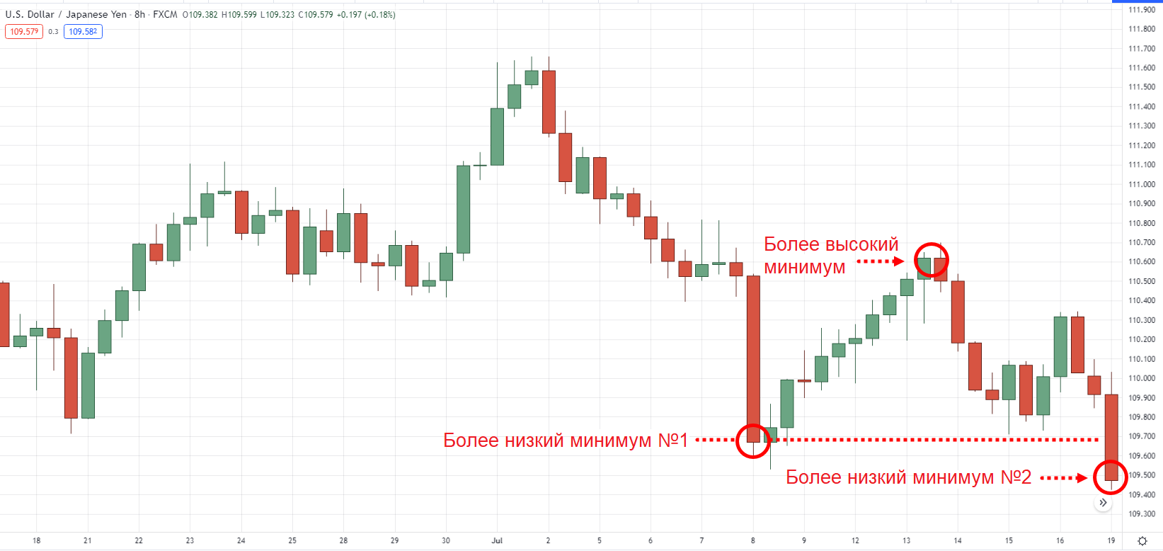 В отличие от выше рассмотренных рыночных структур, более низкие минимальные значения в рамках прайс экшен — самые «донные» цены на графике, которые ниже предыдущих минимальных значений.