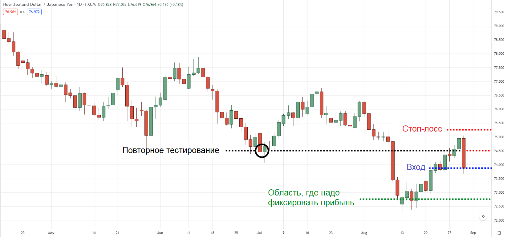 Дневной таймфрейм NZD/JPY (падающий рынок)