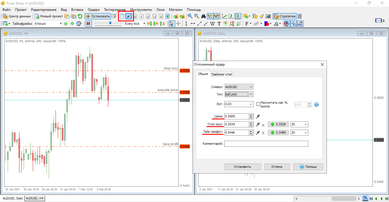 На панеле инструментов выбираем «Новый рыночный ордер» или «Новый отложенный ордер». Вводим нужные параметры для сделки и нажимаем «Установить»: