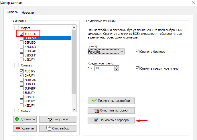 Первым делом нужно загрузить котировки в «Центре Данных». В верхней панели жмем соответствующую кнопку, выбираем валютные пары, на которых будем торговать и нажимаем кнопку «Обновить с сервера».
