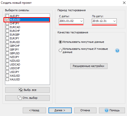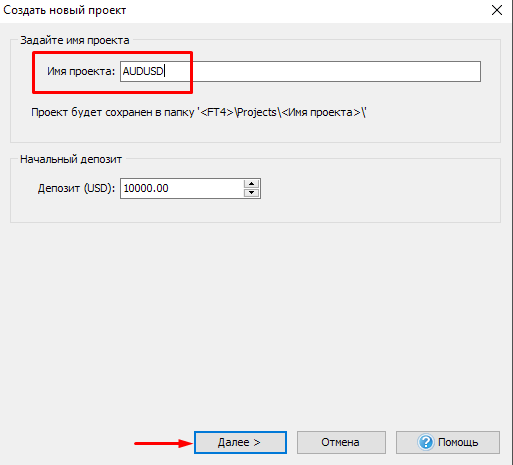 После загрузки в верхней панели выбираем «Проект — Новый». Подпишите его как название валютной пары, на которой собираетесь торговать (EURUSD, EURGBP) и нажмите «Далее»: