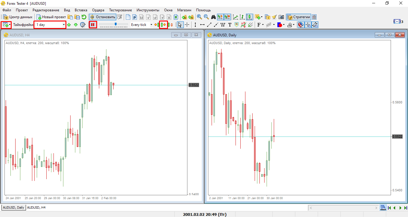 Перед вами откроется график и начнут рисоваться свечи. В верхней панели нажмите на паузу («||»).