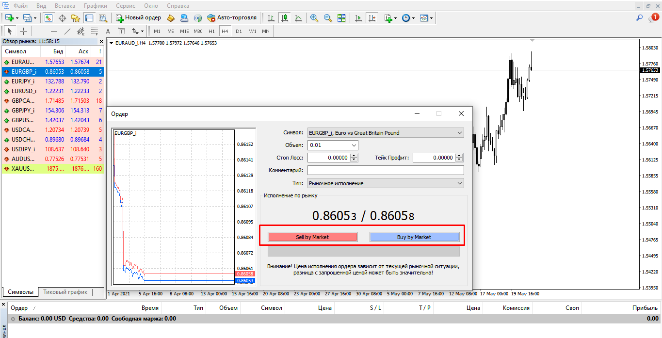Последнее и очень важное. Из-за скопления денег, ликвидности, вы можете купить и продать валюту в любой момент. Нужно лишь указать в терминале цену и нажать кнопку «buy» или «sell» (купить/продать):