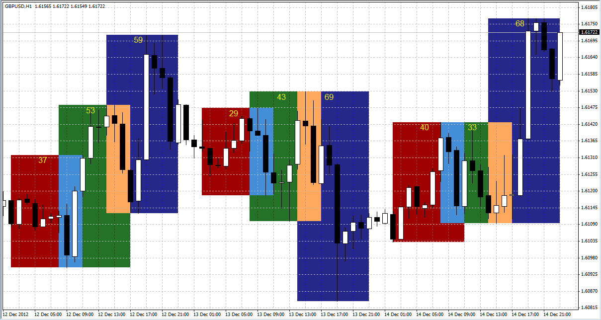 Установив I-sessions на ваш график, вы сможете увидеть примерно следующее. Торговые сессии выделены каждая своим цветом. Также вы сможете видеть пункты расстояния, пройденного ценой внутри каждой сессии.