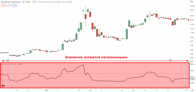 Но индикатор RSI, тем не менее, остается неизменным, независимо от формата отображения графика: