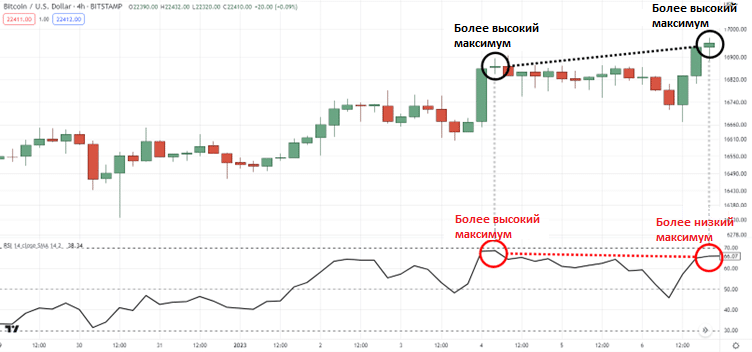 Итак, теперь, имея в распоряжении эти два важных блока информации, где цена формирует новое более высокое максимальное значение, а индикатор — новое более низкое максимальное, мы можем значительно больше: