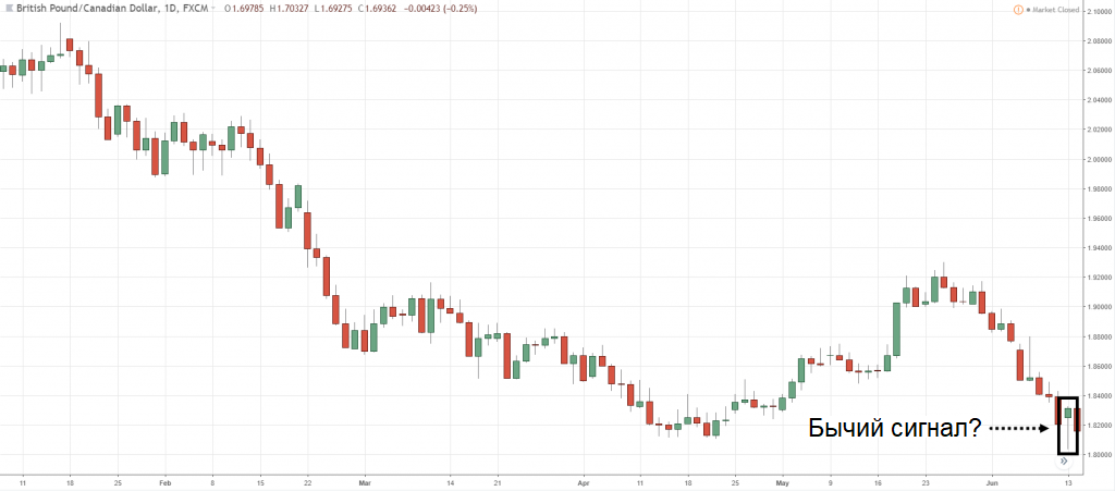 Динамика котировок валютной пары GBP/CAD и бычий пин-бар.