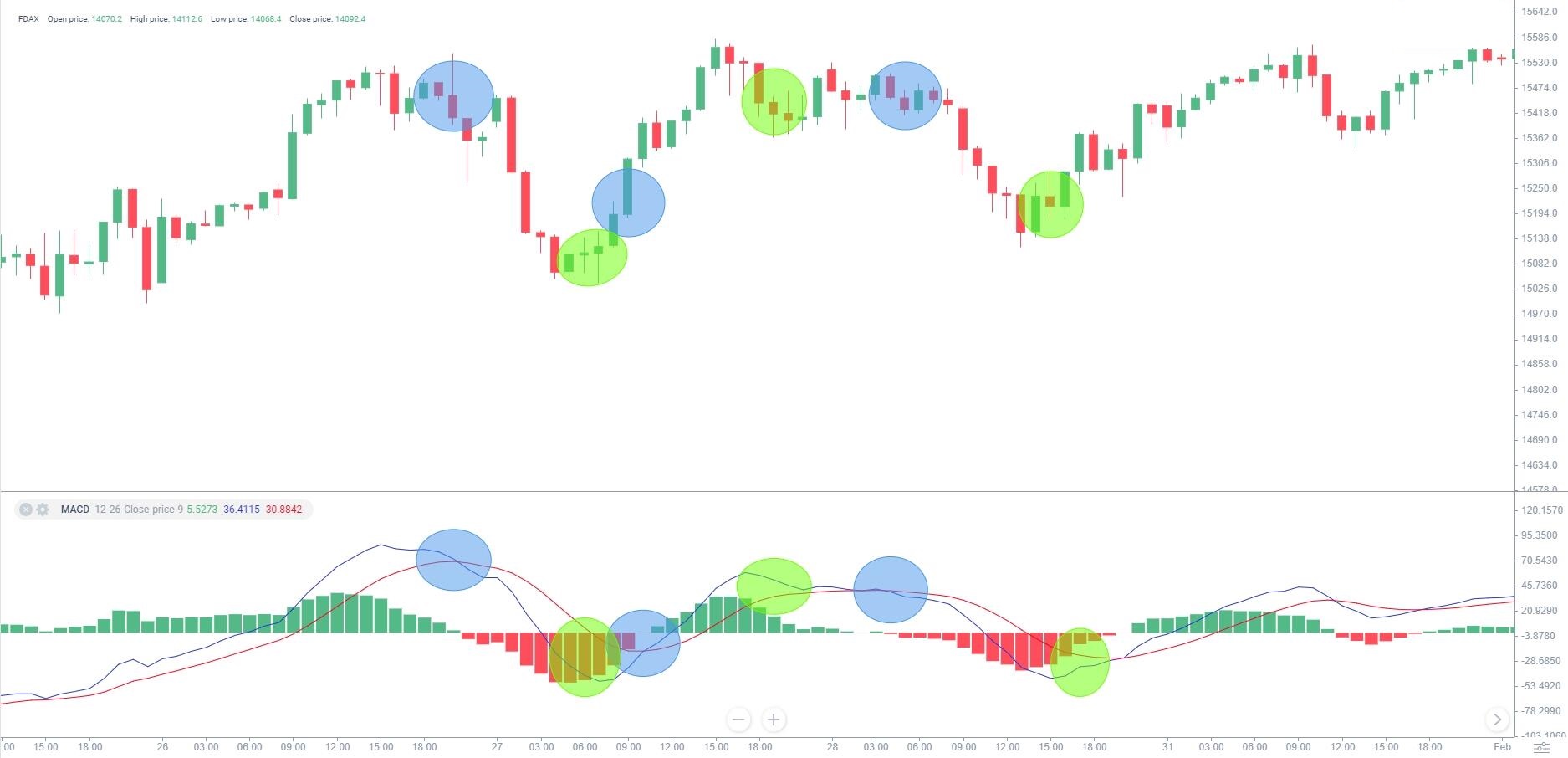 На этом графике моменты входа в рынок выделены синими окружностями. Открытие сделок происходит, когда цена пересекает линию MACD. Зеленые окружности — точки, когда сделку надо закрывать. В этих точках присутствуют признаки угасания тренда. Характерные сигналы угасания — это, когда MACD во флэтовом (мало колебаний вверх-вниз) состоянии, или когда индикатор начинает показывать изменение настроений рынка (направление цены меняется).