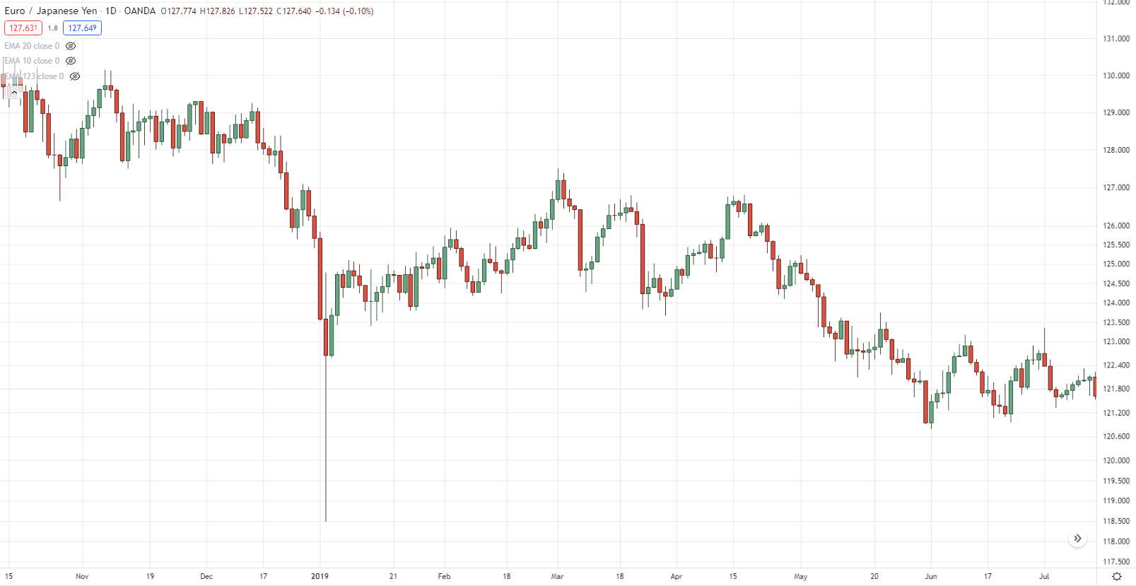 А что если использовать EMA на диапазонном рынке? Применение EMA на диапазонном рынке на дневном таймфрейме: