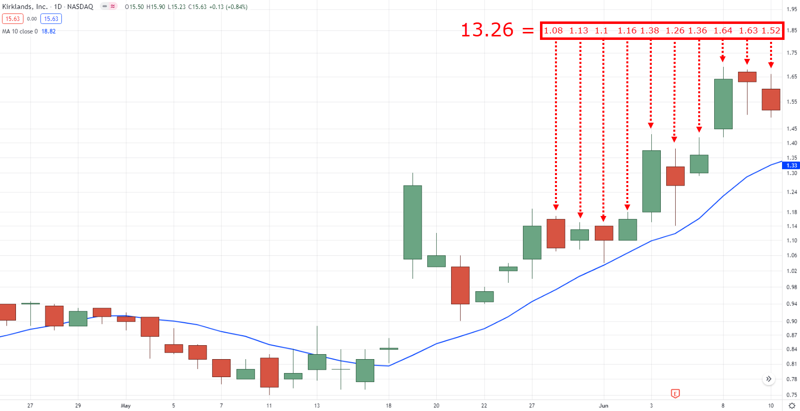 Из графика видно, что сумма всех цен закрытия за последние 10 баров дала значение 13,26.