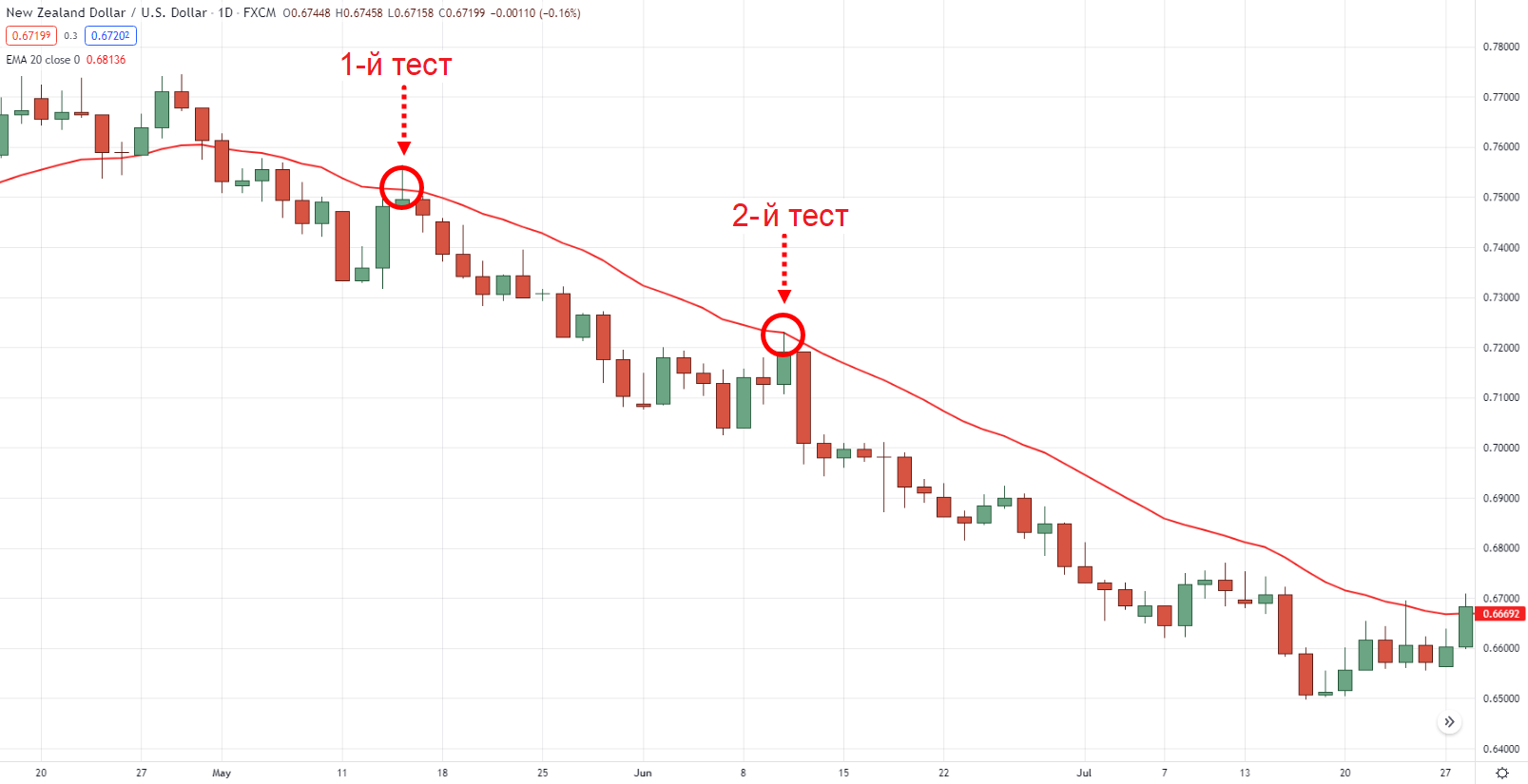 На графике — два эпизода тестирования на 20-периодной EMA на дневном таймфрейме: