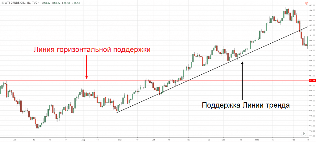 Уровни поддержки и сопротивления — это горизонтальные области на графике, которые показывают потенциальное давление покупателей или продавцов. То же самое и с линией тренда. Только разница в том, что линия тренда не горизонтальная, а с некоторым наклоном.