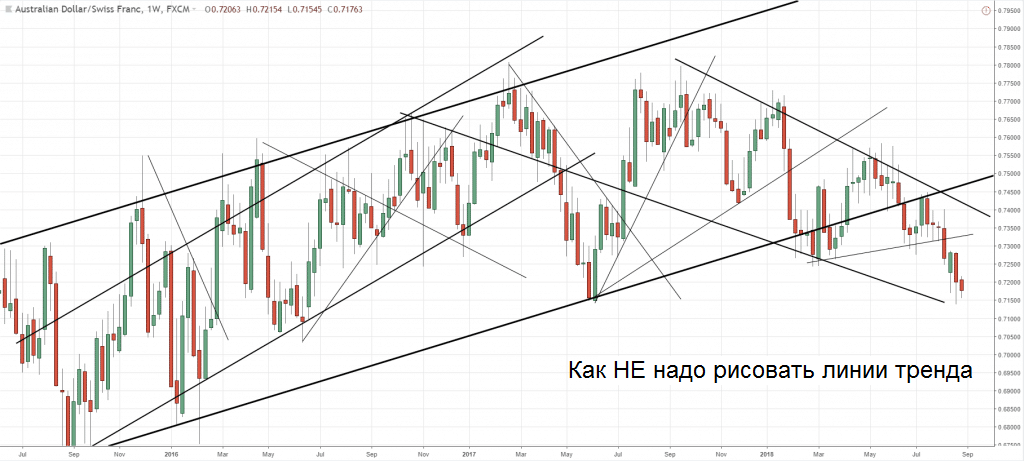 Линии тренда должны быть нарисованы таким образом, чтобы сам трейдер мог разобраться и принять правильное решение, которое поможет не проиграть на Форекс. Ниже — пример, как не нужно рисовать Линии тренда.