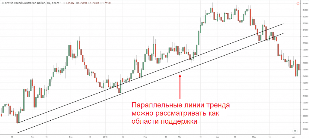 Можно нарисовать две параллельные линии тренда для фиксации трендовой области на графике.