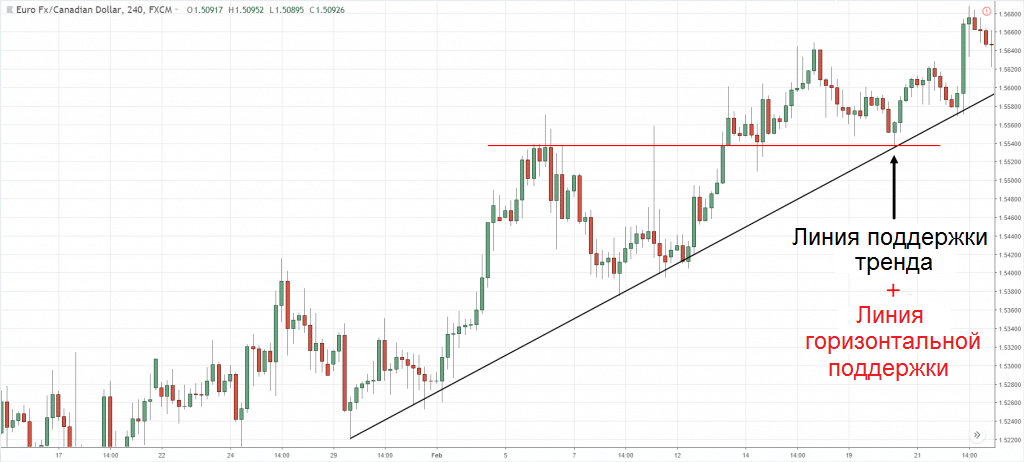 На графике ниже: комбинация из двух линий (горизонтальная поддержка + линия тренда).