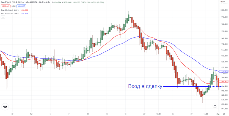 Дожидаемся отката в область рыночной ценности, используя 20ЕМА и 50ЕМА на младшем таймфрейме