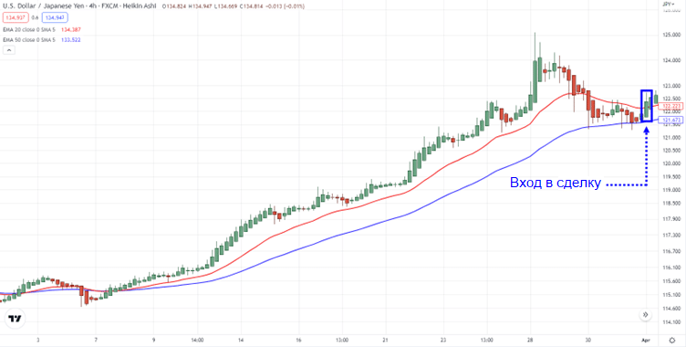 Здесь вы открываете длинную сделку на следующей свече.