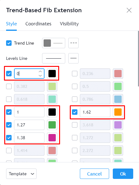 Надо отметить, что инструмент расширения Фибоначчи на платформе TradingView (если вы используете этот сервис) не имеет уровней 127 и 138. И нужно настроить параметры, чтобы получить эти уровни.