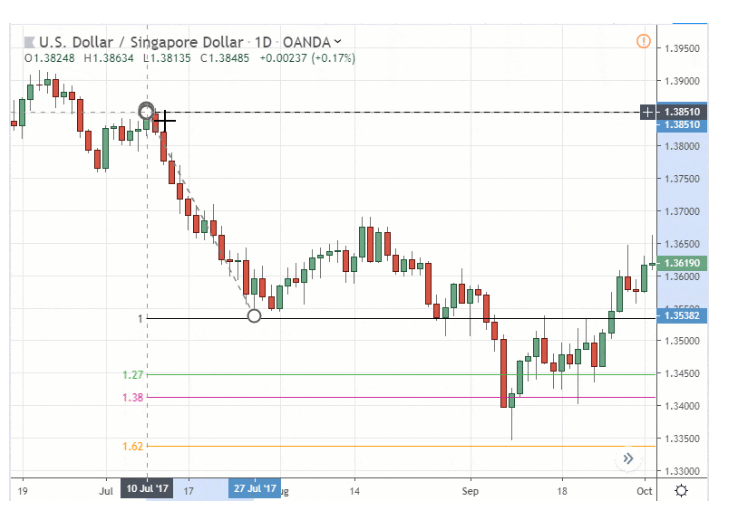 - Нарисуйте расширение Фибоначчи от максимального колебания до минимального колебания.