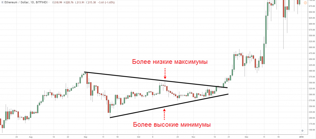 Цена не может «спрессовываться» вечно. В конце концов, она должна выйти за пределы «воронки». И когда это происходит, создается хороший момент для входа.