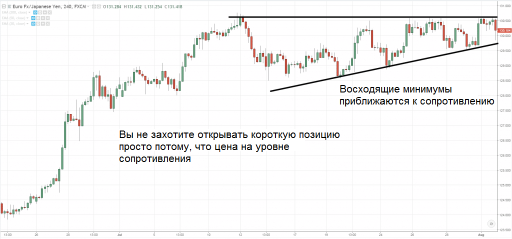 2. Продавцы не давят на рынок. Когда продавцы начинают массированно давить на рынок, цена не имеет шанса долго оставаться на линии сопротивления. Она довольно быстро начинает снижаться. Если цена все еще около «сопротивления», это значит, что продавцы не доминируют в настоящий момент.