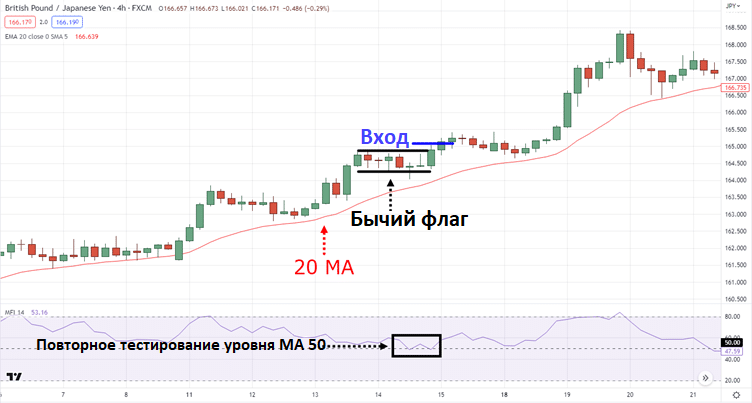 Вам нужно подождать, пока MFI повторно протестирует среднюю точку 50, в то время, как цена немного откатится назад, формируя фигуру «бычий флаг».