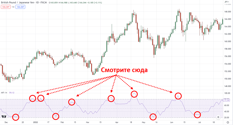 В таких условиях индекс денежного потока часто касается области перепроданности при MFI менее 20.