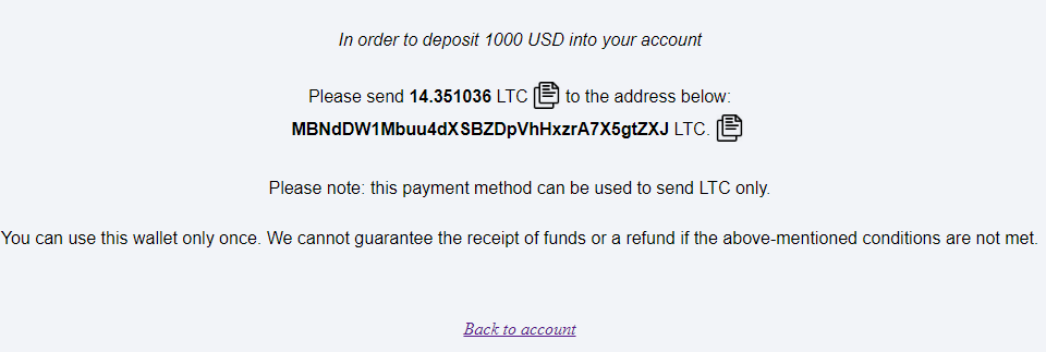 Вы будете перенаправлены на страницу оплаты с адресом кошелька, на который необходимо перевести точную сумму средств в LTC. Для завершения транзакции необходимо зайти в свой кошелек в другом окне и перевести точную сумму LTC на указанный адрес кошелька. Затем, после совершения перевода, средства будут зачислены на счет.