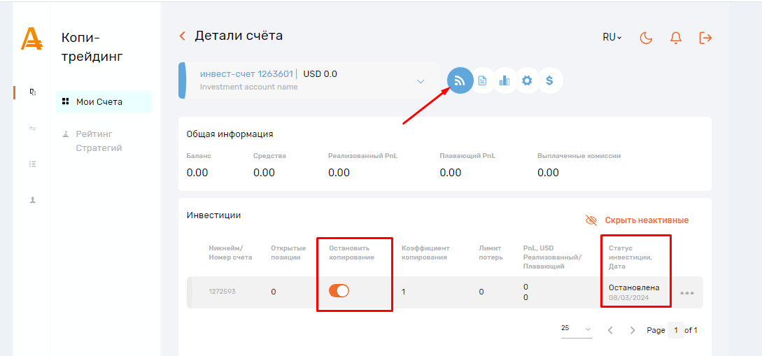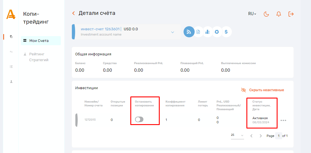 2. В разделе «Детали счета» → «Инвестиции» включите переключатель «Остановить копирование». Статус инвестиции изменится на «Остановлена».