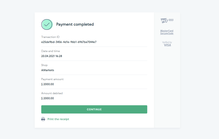 6. Вернитесь в окно браузера, где вы совершаете перевод, и нажмите кнопку «Продолжить». Платеж завершен. Пожалуйста, подождите, пока средства поступят на ваш счет.