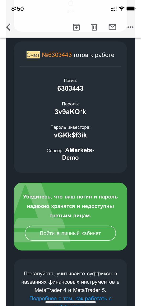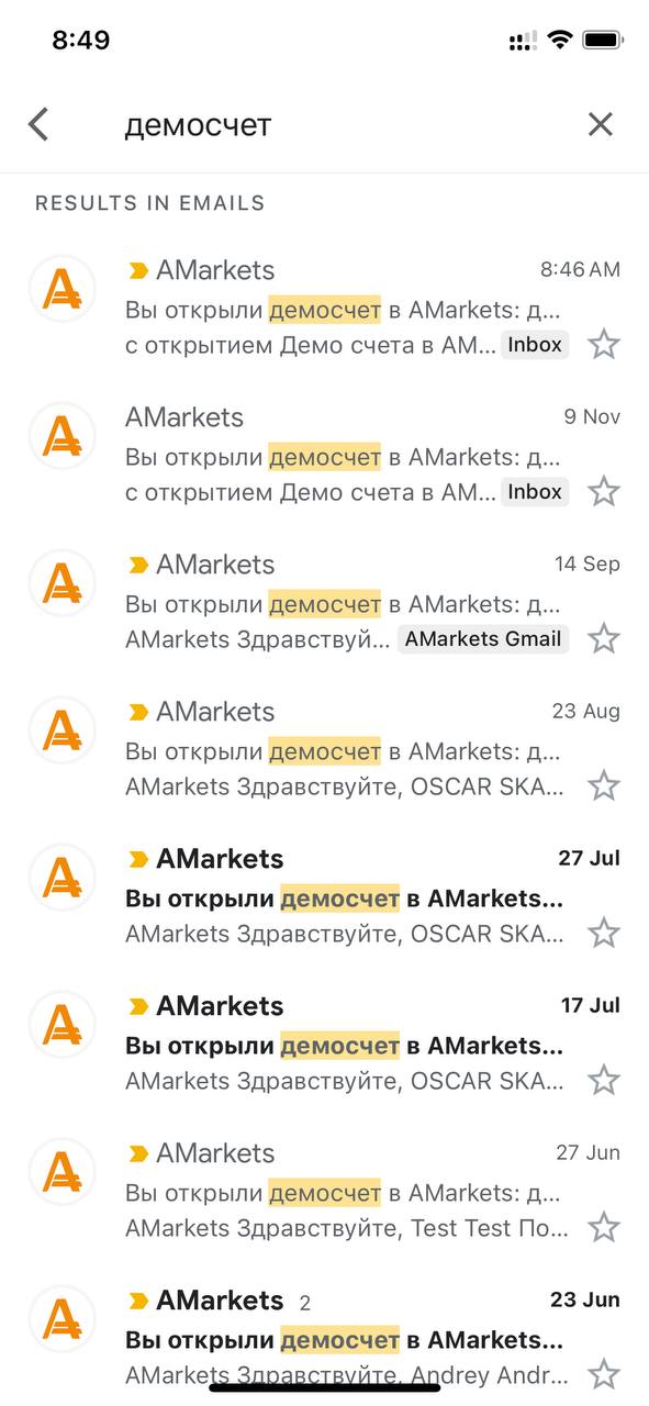 Войдите в свой email и в строке поиска введите заголовок «Вы открыли демо счет в AMarkets»‎:
